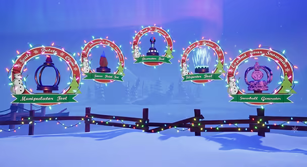 “Use Santa's magical prop table to select various props to create a snowman. Choose from four different tabs, face props, accessories, hat props, and arm/hand props. Each tab has a minimum of 10 different props to choose from, with more coming in future updates.