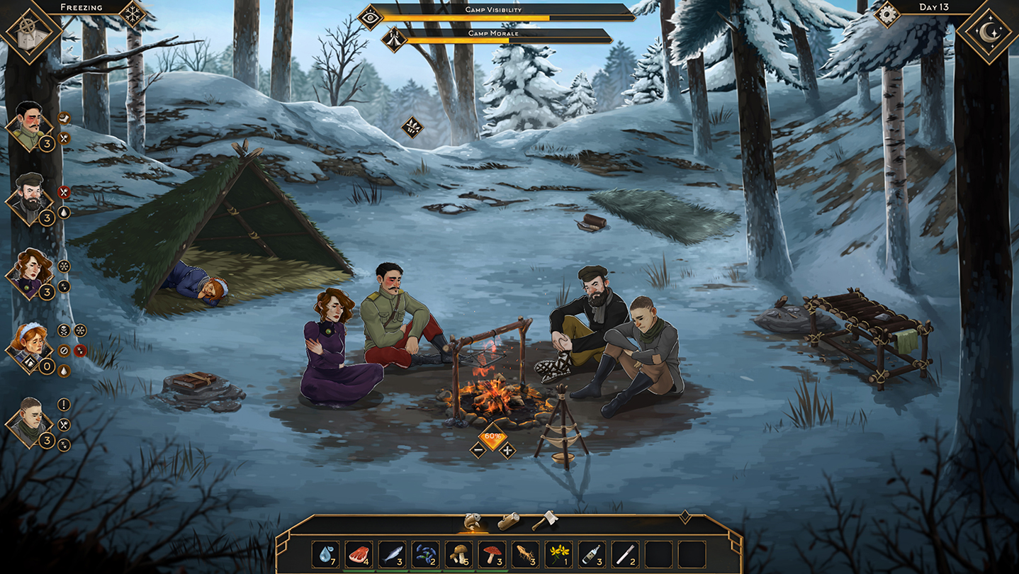 The basic mechanics of the game will focus on the survival of the characters (meeting their needs, gathering resources, expanding the camp, taking care of security, exploring surroundings), but the player will quickly find out that in order to win, he needs much more: to learn the personality of the characters and work out relations between them, mitigating conflicts and taking care of the morale. You may choose to act selfish but it is cooperation that will allow you to win and keep a clear conscience.