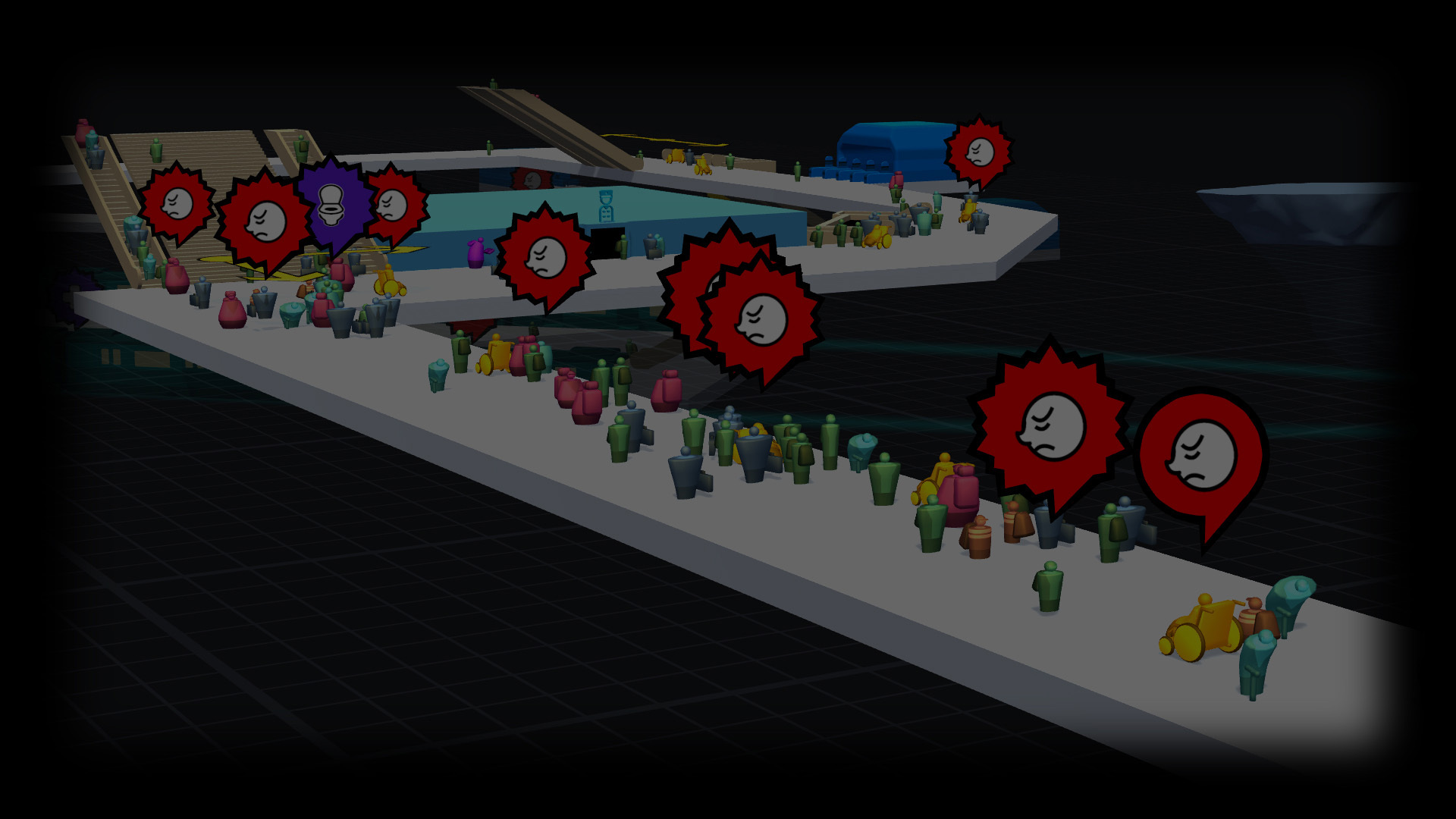 • Manage the flow of thousands of passengers with different needs, stats and targets, simulated in real time.