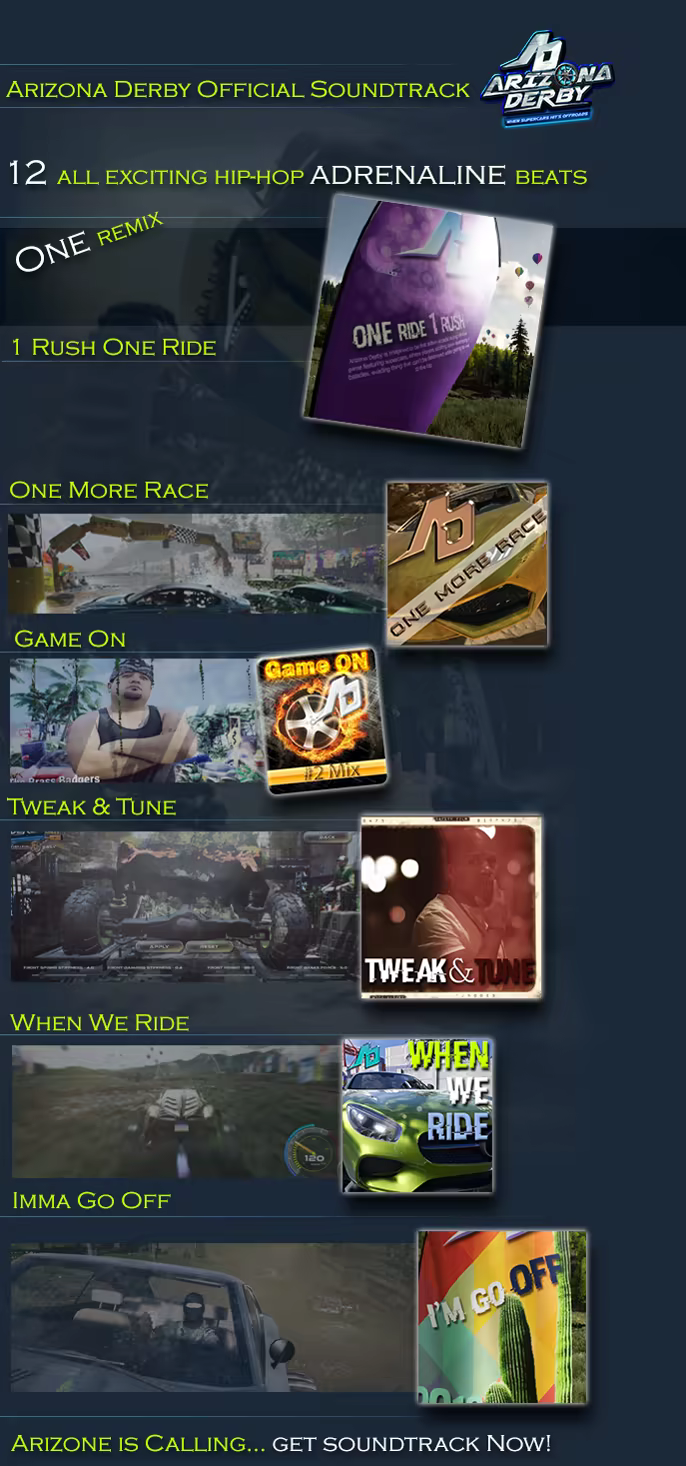 Immerse at official rap "Arizona Derby" Soundtrack featuring numerous hip-hop styled beats and remix, produced by Texas rap artist TxMic especially hyped for the "Arizona Derby" game and its content over course of the 4 years of development.