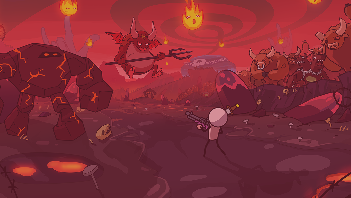 The world around has changed. Green grass withered. The surface was covered with fire. A gigantic hellish cauldron appeared in the distance. Stickman moved to terrible lands when he touched his weapon.