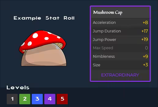 • Stats include Size, Jump Duration, Jump Power, Acceleration, Max Speed, and Nimbleness