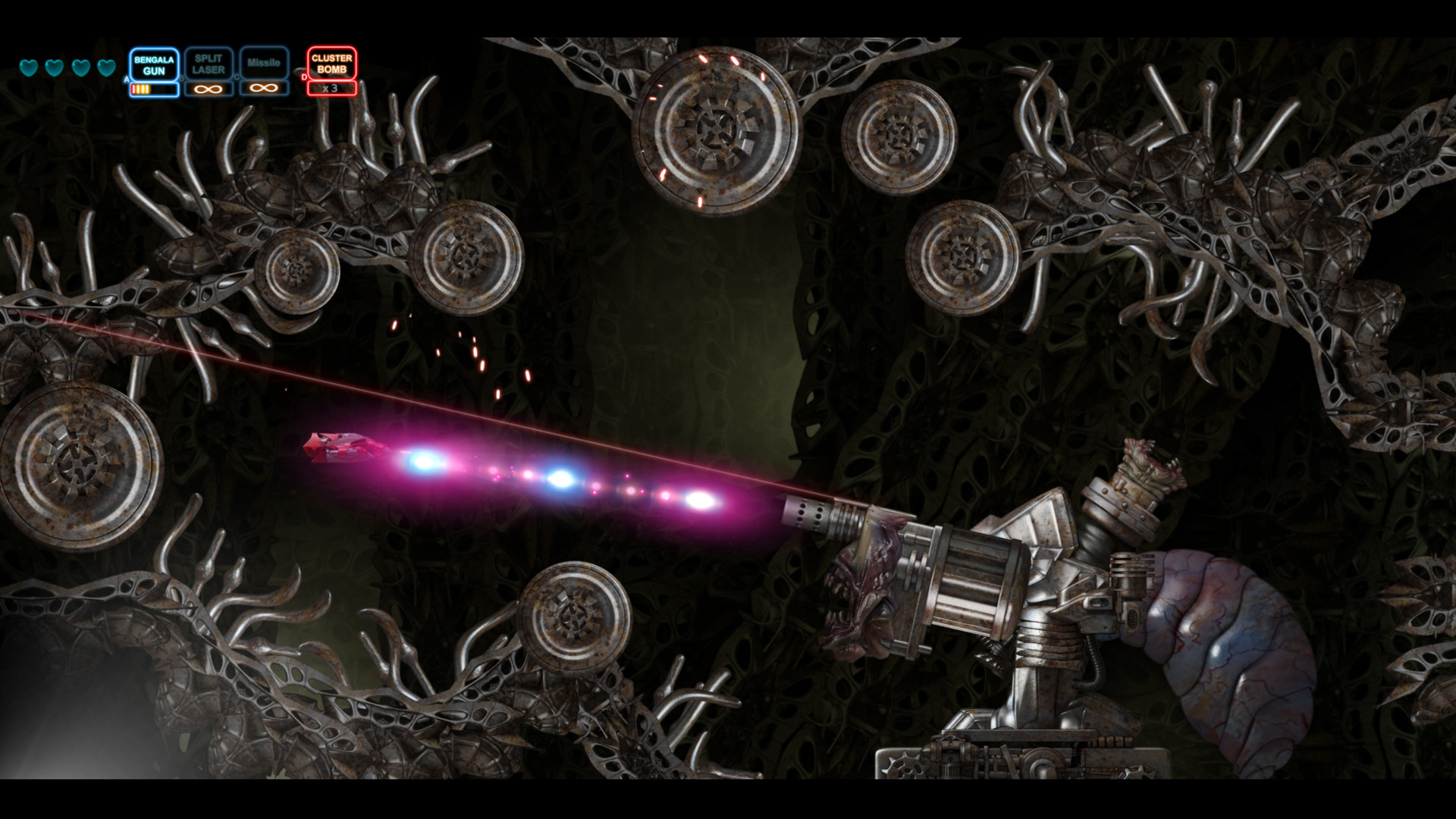The Graphics are huge 3D pre-rendered sprites and are gorgeously animated. It is full of cool menacing Monsters. The backgrounds look fantastic and fit perfectly to the Alien world. The Bosses look so infinity creepy and scary that the cg-artist had to design them with closed eyes ;).