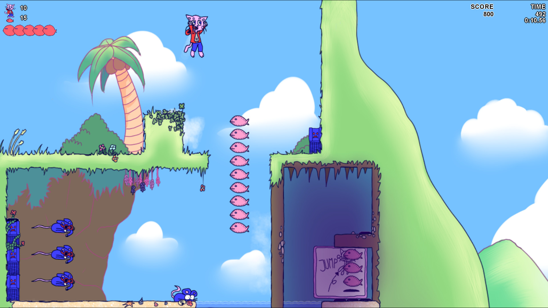 There are many hidden goodies in these levels. Many things can be buried underground, so use your ground pound to uncover them. Find all of the Big Fish to fully complete a level. The level in the world map will become golden if you have found everything in the level, so keep exploring, but don't take too long as you can run out of time!