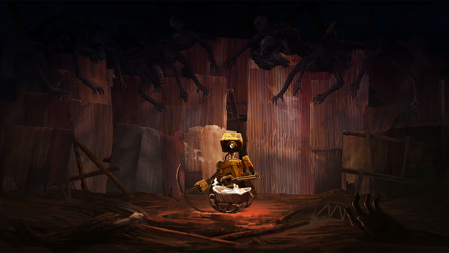 Humanity is almost extinct and the planet lies in ruins. The hopes of humanity lie in the survival of a child, a child that you must protect at all costs from the hordes of the night that will stop at nothing to destroy everything. You embody an all-purpose care robot, awoken by an emergency distress call. As you head to the surface, you intercept an escape pod of a human child, which results in your mission parameters being updated to protect the child at all costs. However, your memory banks are failing- if you could only remember why this child in particular is so important…