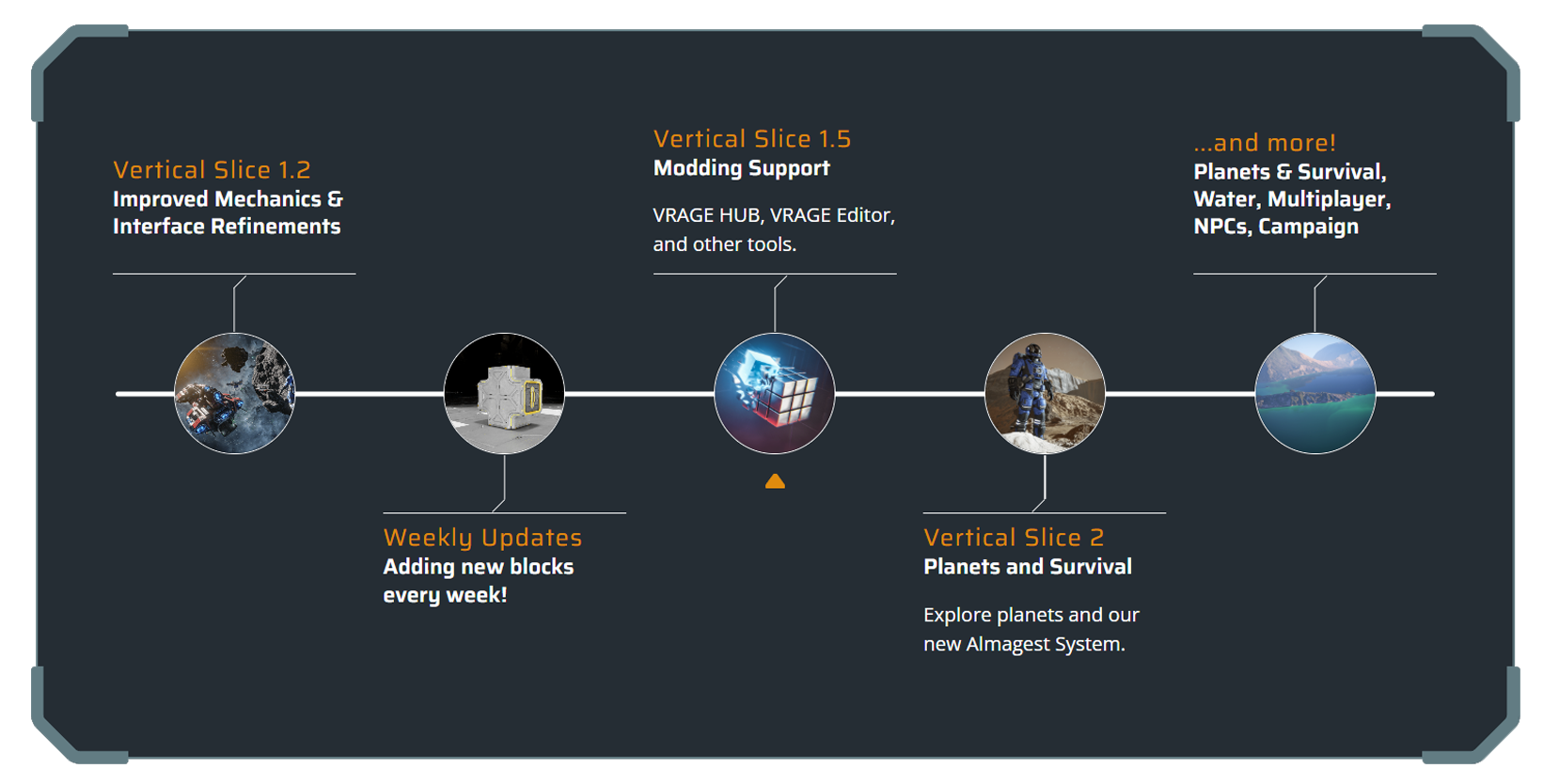 We are developing Space Engineers 2 through larger themed updates we call Vertical Slices.
