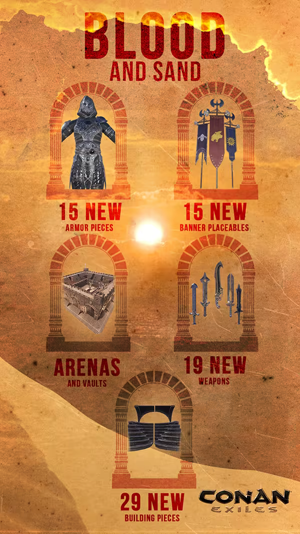 The battle over the Exiled lands is brutal and relentless. With the all new Blood and Sand Pack you can crush your enemies wearing all new armor sets and wielding fearsome weapons while fighting in new vaulted tunnels and arenas.