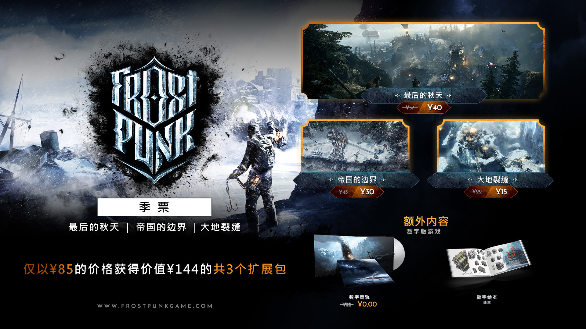 完整版《冰汽时代》季票现已推出!拥有季票后,玩家将能够体验自游戏正式推出后的所有额外内容,其中包含三份扩展包The Last Autumn(《最后的秋天》)On The Edge(《帝国的边界》)以及The Rifts(《大地裂缝》),三份扩展包中的内容对本体故事进行了大幅度的扩展并且填补了游戏世界观中大量未曾讲述的剧情。当通关游戏之后,你还能够聆听着Digital Soundtrack(数字音轨)的精妙编曲放松自己,或者翻阅独家Digital Artbook(数字绘本)进一步了解冰汽时代的世界。