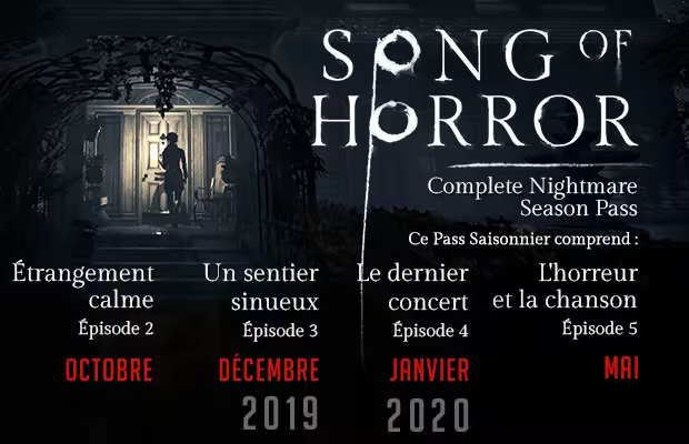 Le Season Pass de Song of Horror Complete Nightmare est une expérience unique et effrayante qui se déroulera en quatre épisodes. Obtenez le Season Pass Complete Nightmare pour jouer aux épisodes 2, 3, 4 et 5 à un prix réduit dès leur publication. Voici la feuille de route de Song of Horror :