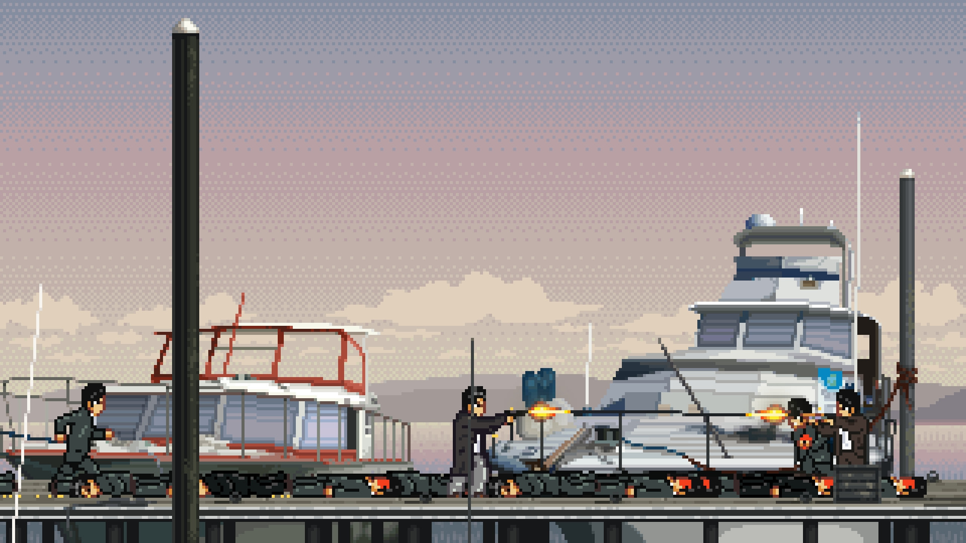 As a professional killer you'll live through November 1976 alternating non-stop shoot'em up action with a downtempo mundane life.