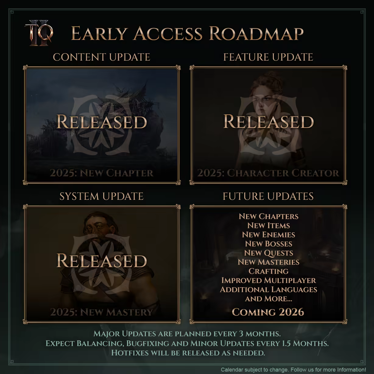 “We plan to develop additional masteries, new content and world segments, stories and quests as well as new supporting features to enhance the game’s longevity like crafting. We plan to release these things as Early Access updates as soon as they are ready. The cadence of updates we plan is small updates (bugfixes, balancing, minor polish updates) monthly (can be skipped if nothing major is needed) and major updates roughly every 3 months which will add major new features, mechanics and/or content. Also we plan to add translations during Early Access - currently its English only.”
