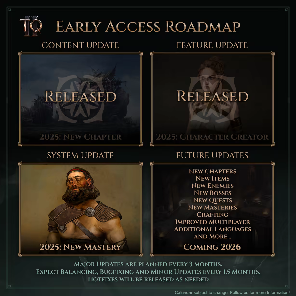 „We plan to develop additional masteries, new content and world segments, stories and quests as well as new supporting features to enhance the game’s longevity like crafting. We plan to release these things as Early Access updates as soon as they are ready. The cadence of updates we plan is small updates (bugfixes, balancing, minor polish updates) monthly (can be skipped if nothing major is needed) and major updates roughly every 3 months which will add major new features, mechanics and/or content. Also we plan to add translations during Early Access - currently its English only.“