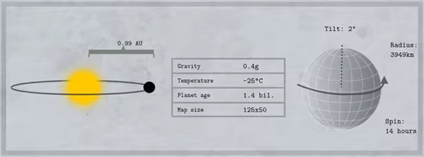 Detailed, procedurally generated planets that adhere to the rules of Astrobiology can be explored. Including detailed climate, rainfall, deserts, snow, glaciers, lava streams, deep forests, alien evolutions, mountain chains, resources, rivers, biohazard levels, respiratory hazard levels and more.