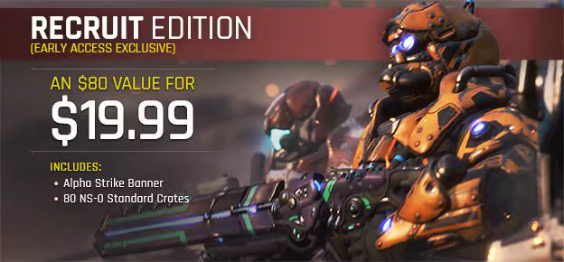 Includes an Early Access exclusive "Alpha Strike Banner" and 80 NS-0 Standard Crates (an $80 value). Unlock mods and weapon, armor, and helmet skins to create your ultimate soldier!