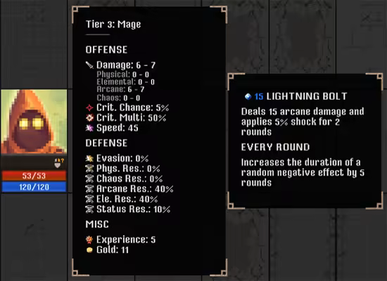and they get random abilities as the game progresses. Abilities can trigger on discover, on death or every round. Enemies are also able to cast spells.
