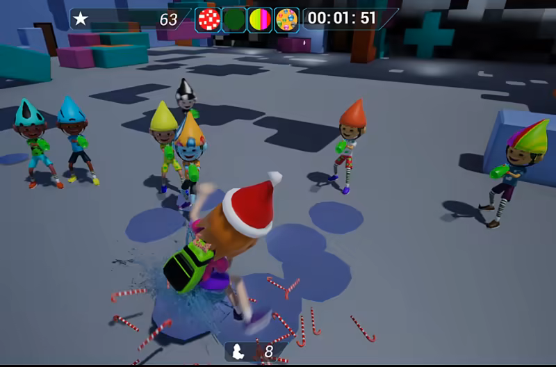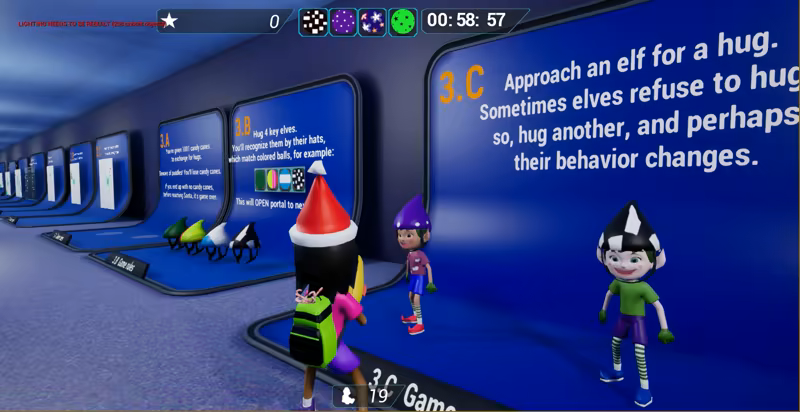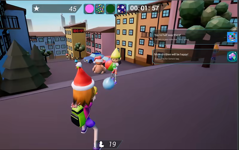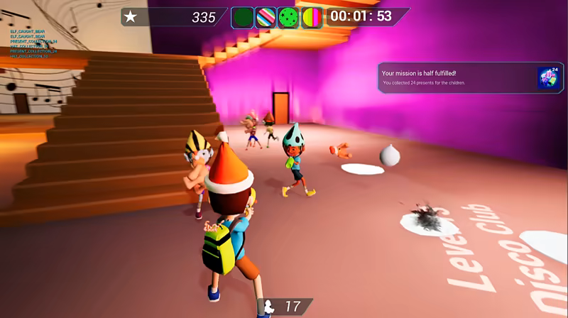 To pass levels you need to open portals; to do that you hug 4 key elves, and in return they get a candy cane.