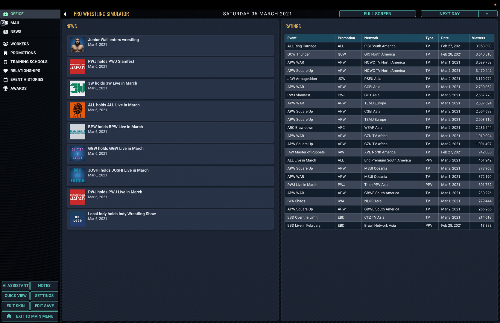 Pro Wrestling Sim is a text-based pro-wrestling booking simulator. Control a wrestling promotion, decide your roster, and create storylines, feuds and matches where the winners and losers are in your hands.