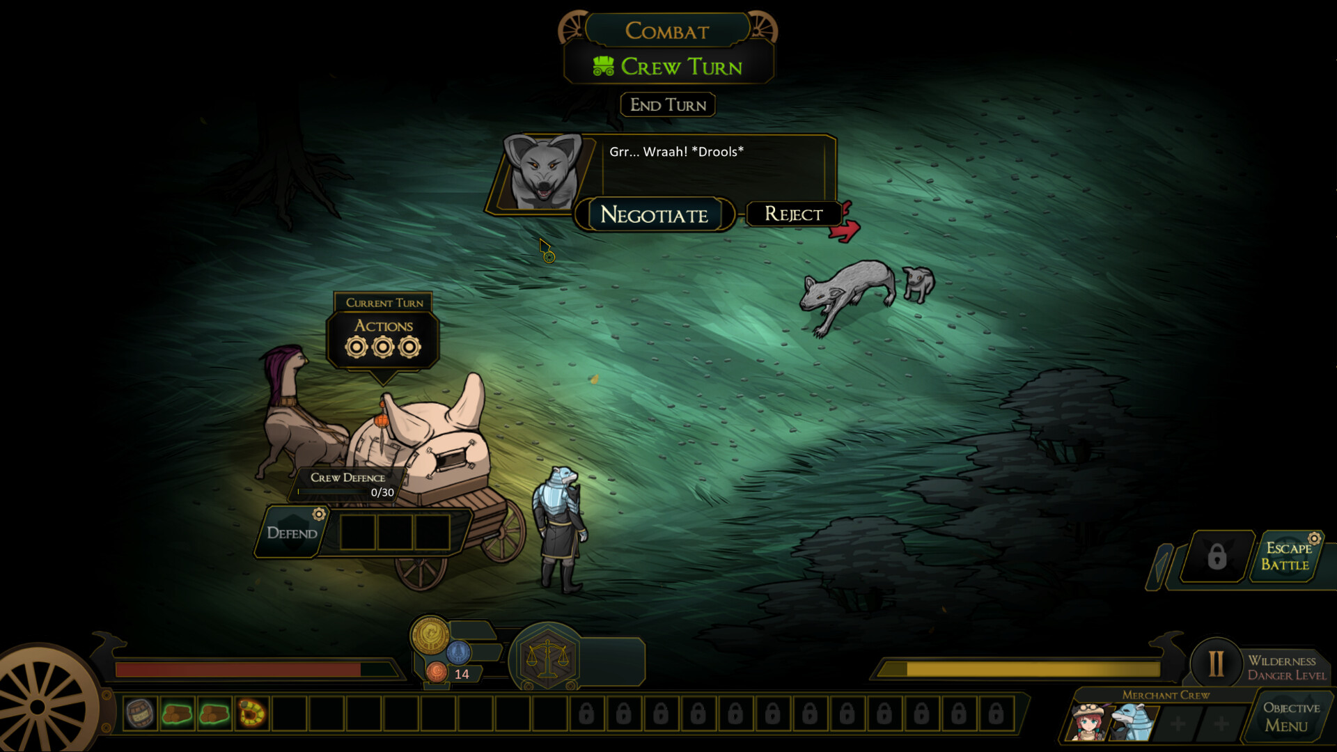 Bandits and wild beasts are constantly eyeing your wagons. Experience turn-based combat with a merchant twist: each of your trading goods can be used for attacking or defending with its own unique effects.