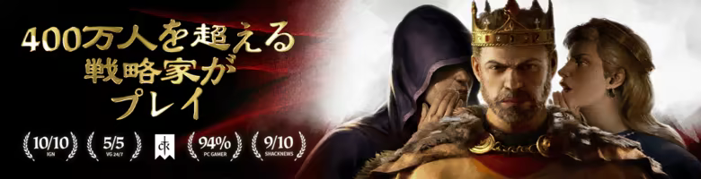 レガシーを築き上げよ。貴族の一族を選び、自らの王朝を中世の大国へと育て上げ、何世代にもわたって繁栄させるのです。戦争は、支配を確立するための無数の手段の一つに過ぎません。真の戦略には、熟練の外交技術、領土の確固たる統治、本当の意味での狡猾さが必要です。Crusader Kings IIIは、Paradox Development Studioの人気シリーズ最新作。中世ヨーロッパを舞台とし、没入感の高い壮大なストラテジーゲームと、ロールプレイがさらにドラマチックに楽しめるようになりました。