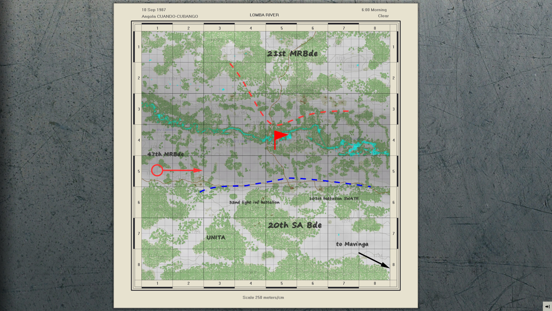 The 21st FAPLA MRBde was moving from Cuito-Cuanavale to the south-east towards r.Lomba. Reaching the north bank of the river, Bde had to cross it. And then continue the offensive together with the 47th Bde in the direction of Mavinga town, where a runway was located, which would allow the Angolan air force to support further attack on Jamba, the UNITA headquarters. The 21st MRBde approached r.Lomba from the north. The engineering units of the brigade made a pontoon bridge across the river, which allowed them to transfer heavy vehicles and weapons to the south bank and continue the offensive to Mavinga. But the Angolan forces clashed with the SADF, which began combat operations in support of UNITA, in the area of the crossing. This was the first major battle of Operation Moduler!