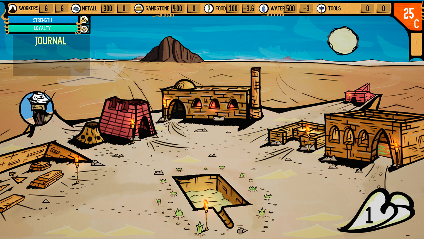 Don’t let people exhaust themselves or stop trusting you. The people here are harsh, just like the desert. If your energy drops to zero, you will get killed. If people stop trusting you, they will start stealing resources for their survival. Construct buildings where they can rest and give people days off. Do not let this story end too quickly.