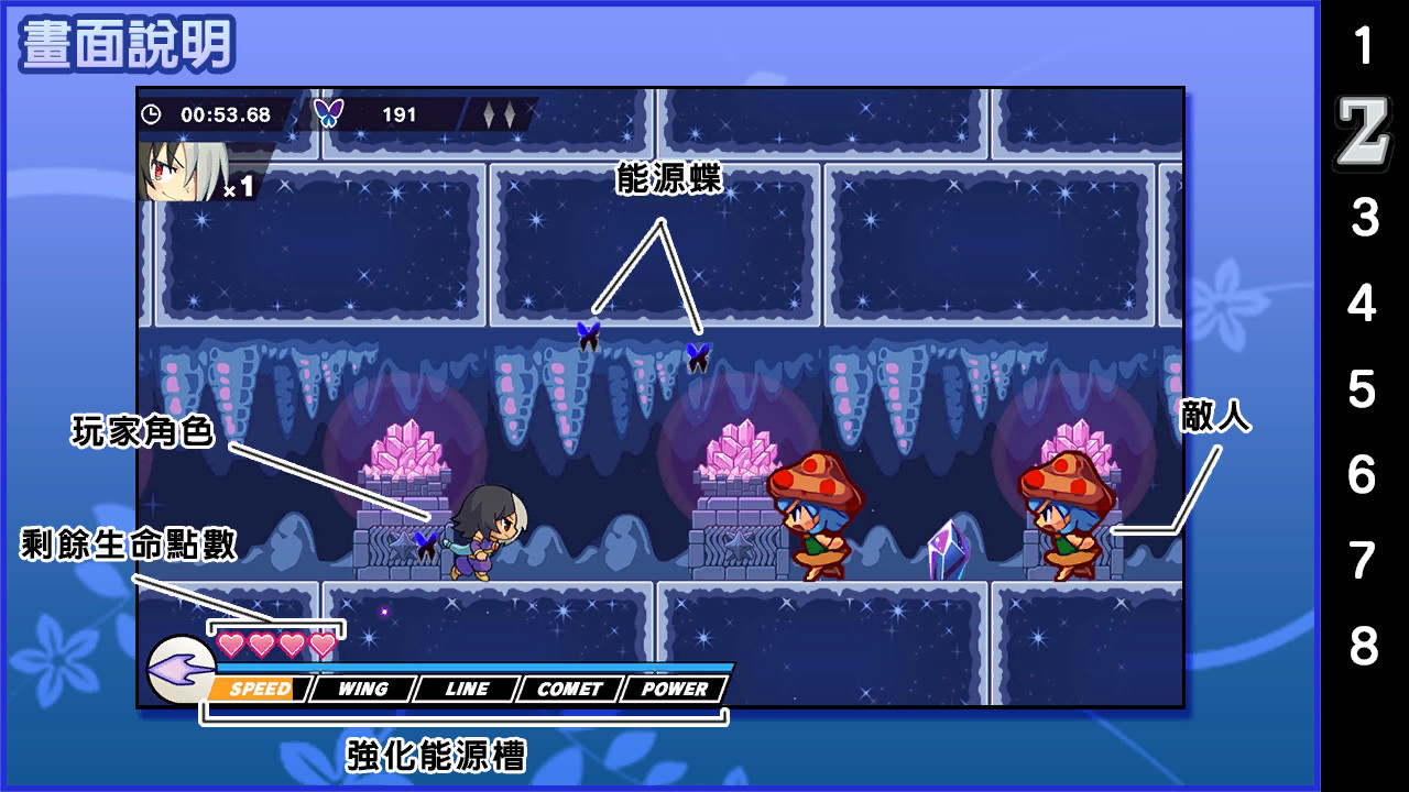 在打倒敵人後將出現「能源蝶」,玩家可透過它來強化主角姬絲,