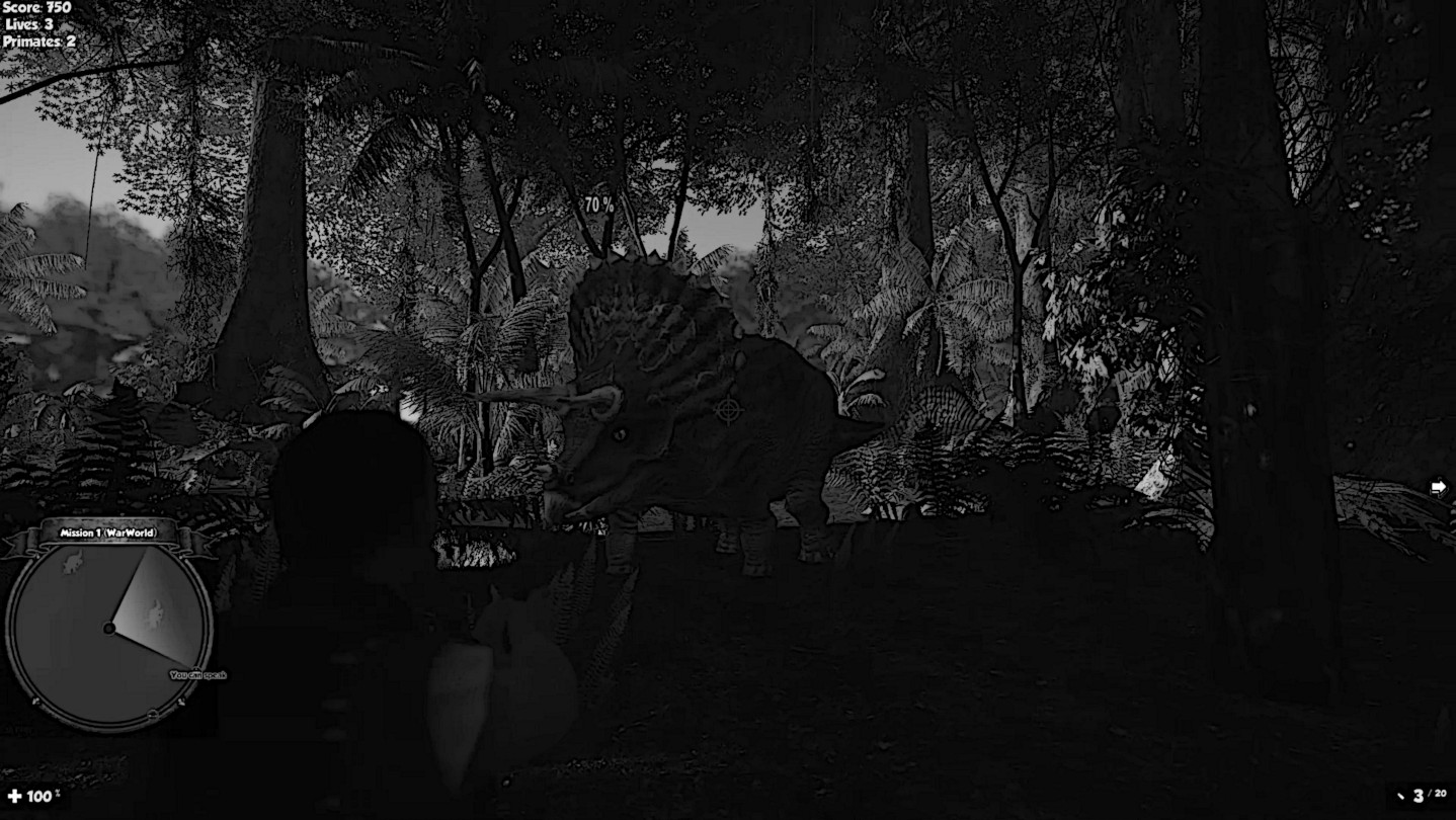 In an ancient world (Jurassic and Cretaceous) when dangerous dinosaurs lived for hunt and survive. You have to preserve your life and our ancestors primates in this world. You will have much weapons to hunt and defend. With zoom you can be more accurate. In dark jungle you can use light to see better.