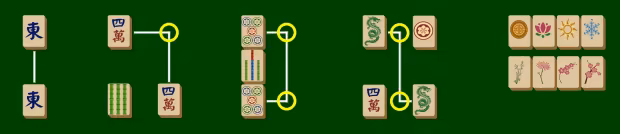 The classic game has 144 Mahjong tiles laid out flat in an 18 x 8 rectangle. Match pairs of tiles to clear the board. Tiles can be matched by a single straight line, a line with one bend, or a line with two bends. A tile from the Seasons or Flowers suits can be matched with any other tile of its type.