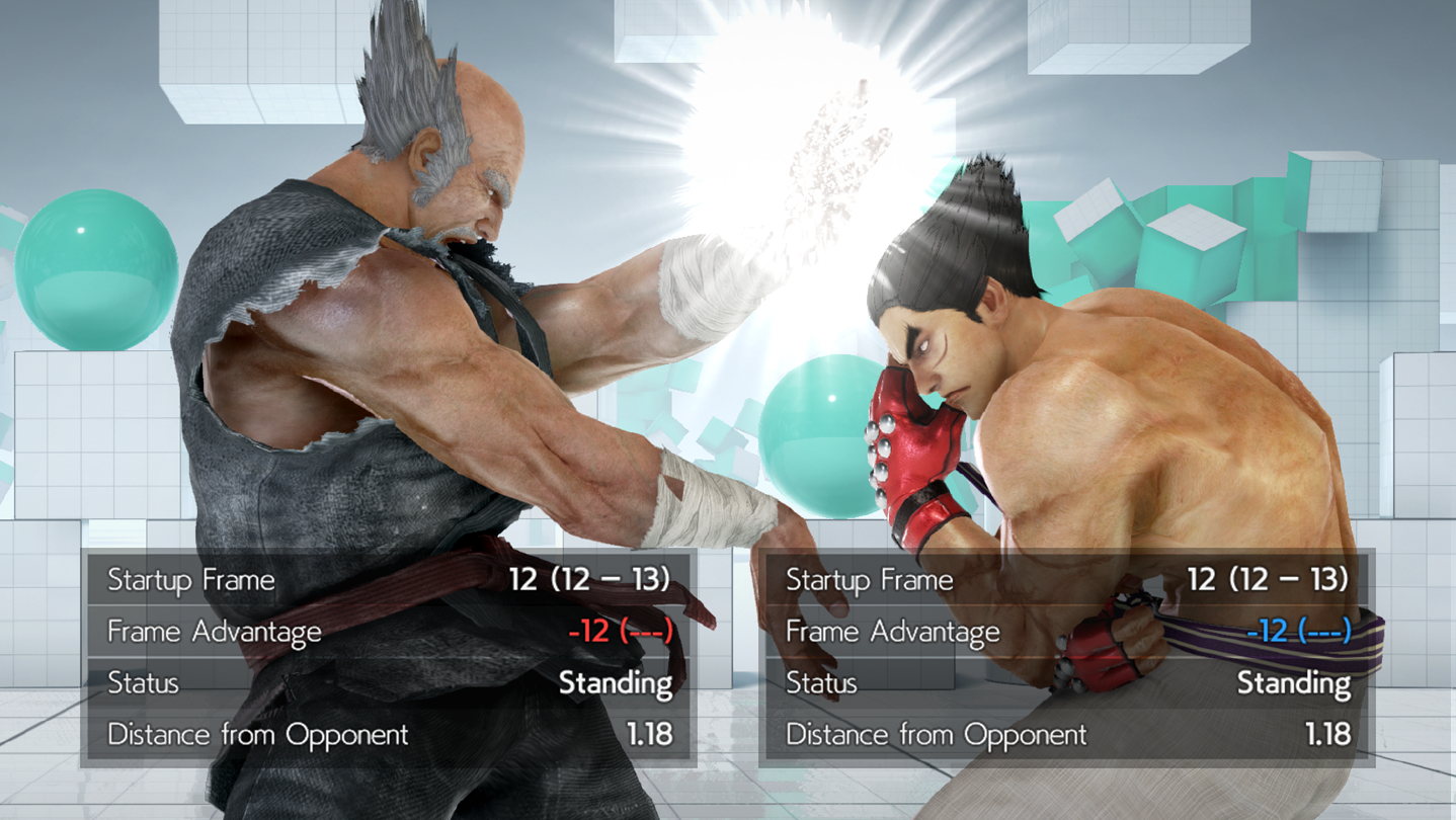 View frame data using one of two different modes: "Simple Display" and "Detailed Display." The feature is available in Practice Mode, Warm-Up Mode (while waiting to join an online match), within online player matches, and while spectating tournaments.