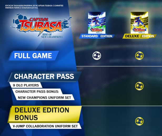 A Deluxe Edition inclui o jogo completo Captain Tsubasa: Rise of New Champions, o Character Pass e acessórios V Jump como bónus.