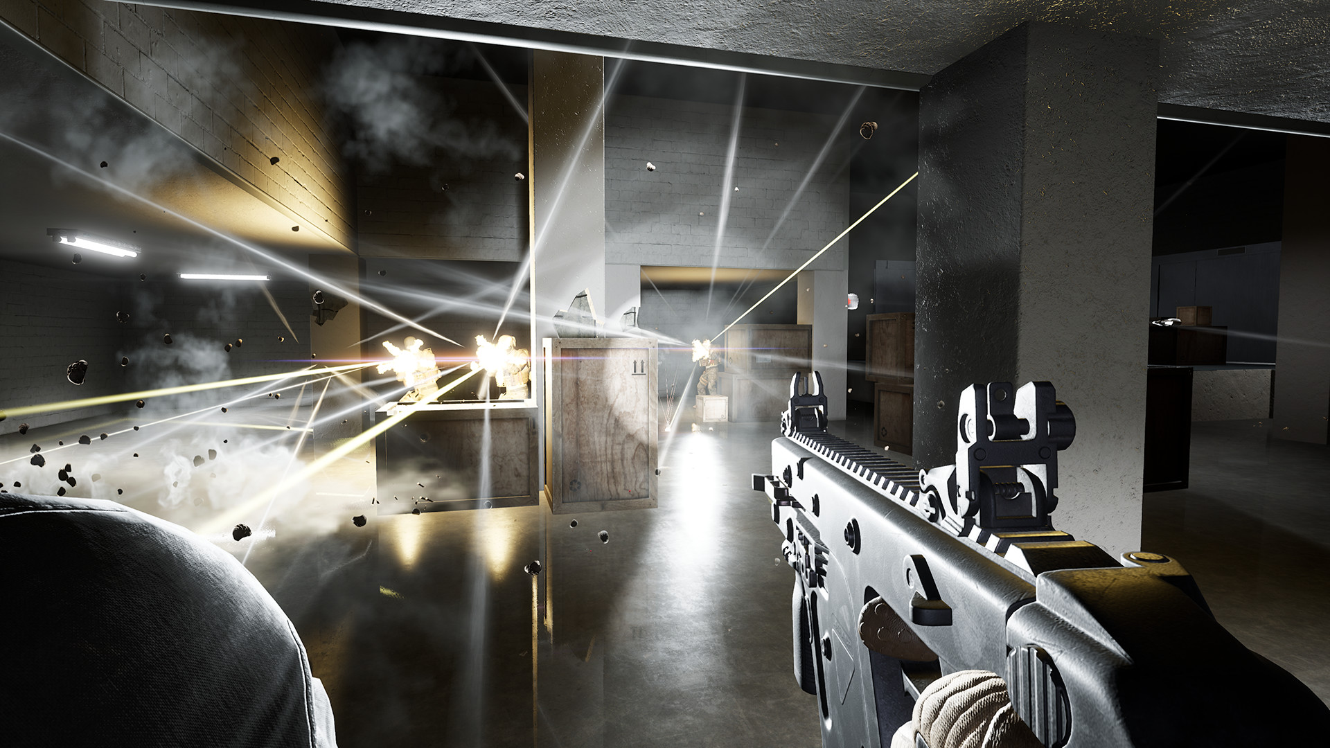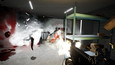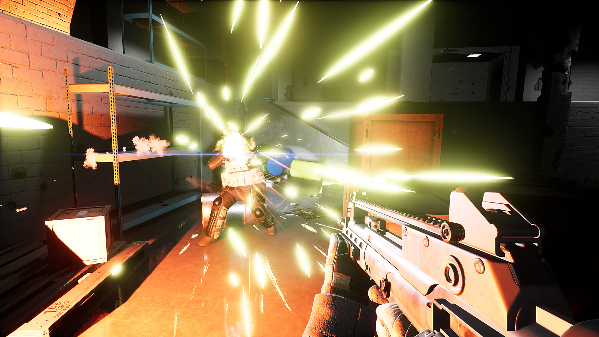 First person guns and melee attacks that leave bloody bullet holes on human enemies and blood splatter on nearby surfaces. Powerful weapons will often dismember enemies, (separating limbs from their body) or destroying their bodies entirely, leaving only bloody remains.