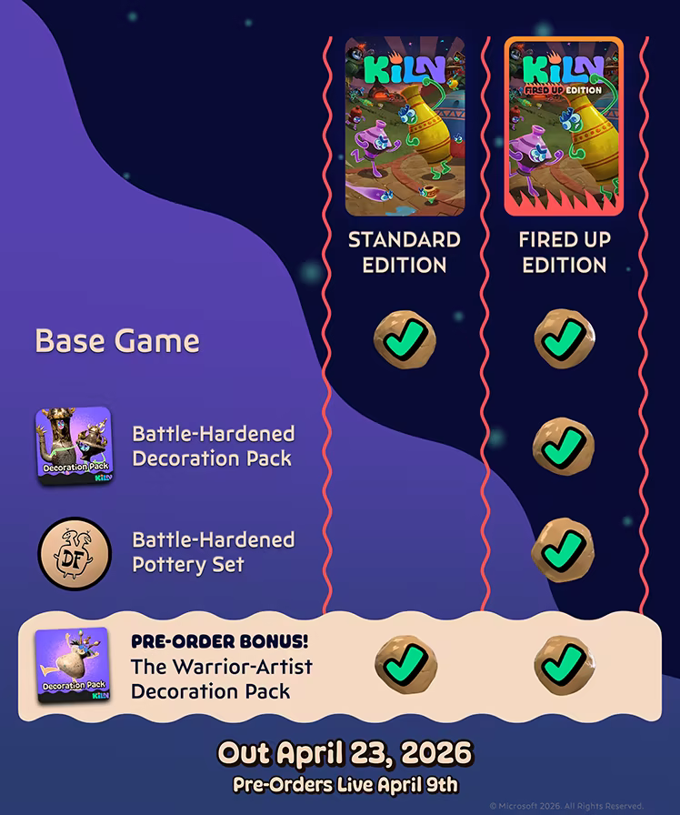 Keramiikkateemainen monen pelaajan party brawler -verkkopeli Double Fine Productionsilta. Kokoa värikkäiden henkiolentojen tiimi kavereistasi ja vala savihaarniska dreijalla. Astioiden koko ja muoto määrittävät pelityylin ja kyvyt – tehkää yhteistyötä ja sammuttakaa vihollisen uuni!