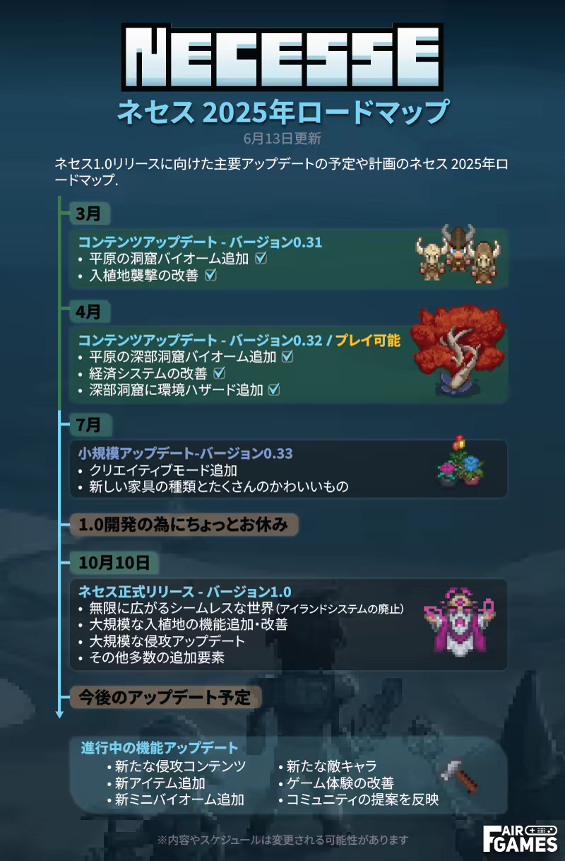 建築、冒険、征服──拠点の拡大や、海賊王・ドラゴン・堕ちた魔道士たちとの戦闘。そんな大冒険の中で、無限に生まれ変わるこの世界、『Necesse』に潜む謎が徐々に解き明かされていく。君はこれから毎日、財宝や装備品の素材を求めて、ひたすらダンジョンを駆けずり回ることになるかもしれない…あるいは燃え上がる冒険心に身を任せ、広大なる海を渡り、その腕前を試すべく強敵を探し回ることになるかもしれないな。特定のスキルを持つ入植者を雇い、彼らと共に様々な鉱石を採掘し、君好みの装備を作り上げ、活気ある村づくりに励もう!