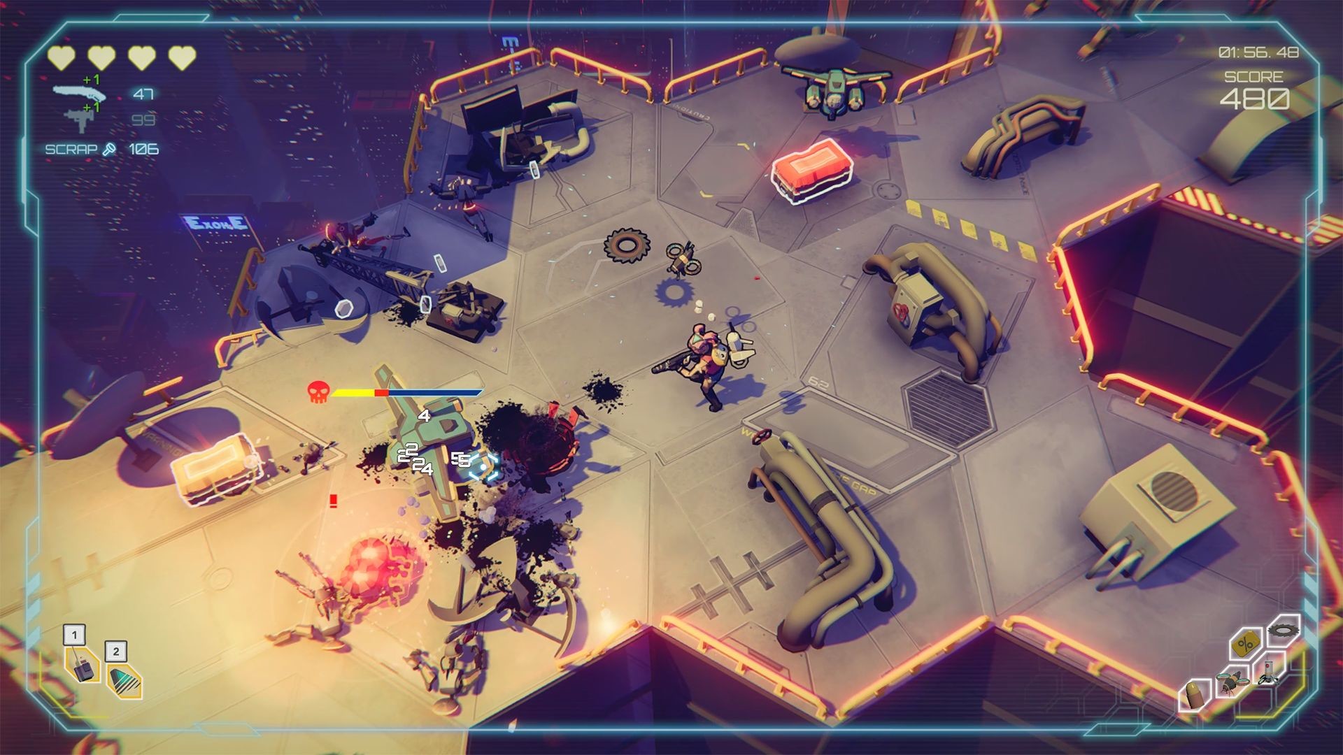 • Defeat 5 greedy corporations. Face 30+ types of enemies, their special versions, and bosses. Choose from a large selection of 30+ various weapons, 50+ active and passive items and upgrades to buy or loot.