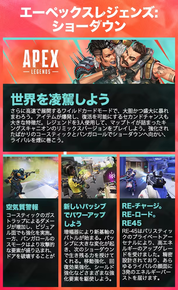 次々と登場する個性豊かなレジェンドたち、奥深い戦術性の部隊プレイ、バトルロイヤルを超えた大胆な進化。何でもありの荒涼とした世界で、これらすべてを極めろ。ヒーローシューターの進化形にようこそ。