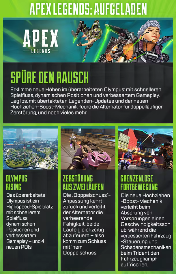 Apex Legends ist der preisgekrönte Free-to-Play Helden-Shooter von Respawn Entertainment. Meistere einen wachsenden Kader legendärer Charaktere mit mächtigen Fähigkeiten & erlebe das strategische Squadspiel und innovative Gameplay der nächsten Evolutionsstufe des Helden-Shooters & von Battle Royale.