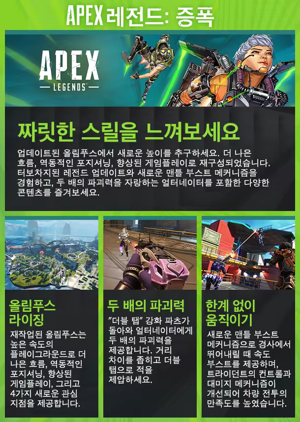계속 추가되는 레전드, 깊이 있는 전술적 분대 플레이, 배틀 로얄 그 이상의 혁신을 경험하세요. 이 모든 것이 어떤 제약도 없는 거친 세계에서 펼쳐집니다. 새롭게 진화한 히어로 슈팅을 플레이하세요.