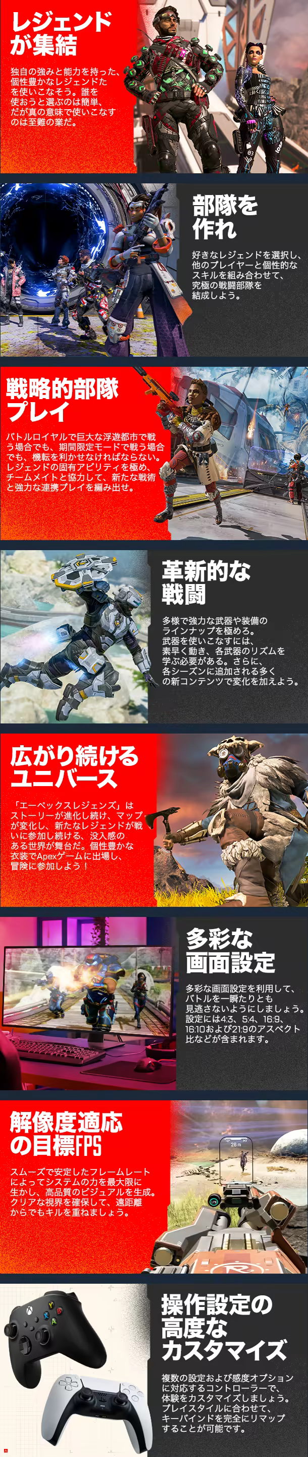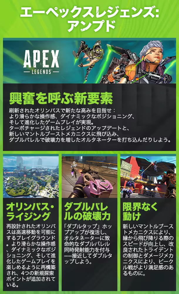 次々と登場する個性豊かなレジェンドたち、奥深い戦術性の部隊プレイ、バトルロイヤルを超えた大胆な進化。何でもありの荒涼とした世界で、これらすべてを極めろ。ヒーローシューターの進化形にようこそ。