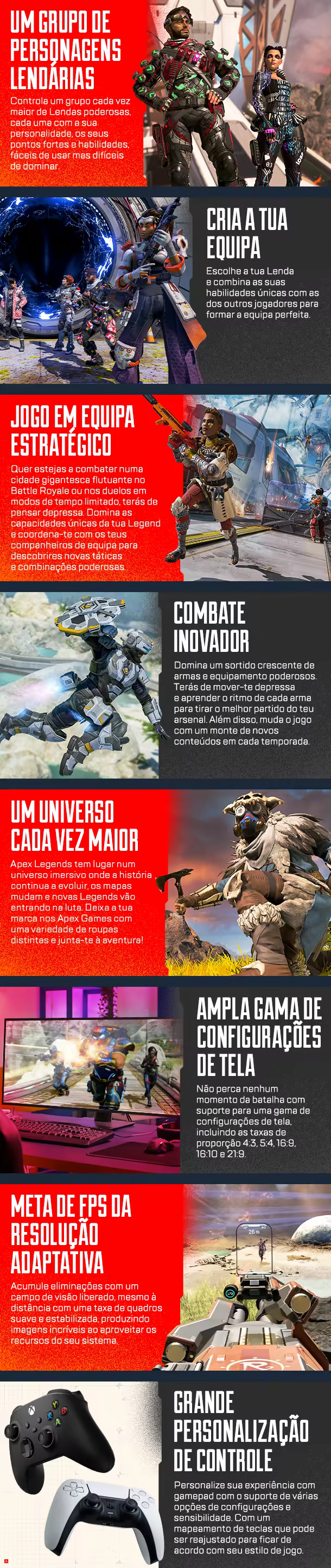 Apex Legends é o premiado jogo de tiro em primeira pessoa de heróis e heroínas da Respawn Entertainment. Domine um elenco cada vez mais amplo de personagens lendários com habilidades poderosas, experimente partidas estratégicas e a jogabilidade inovadora na próxima evolução do gênero battle royale.