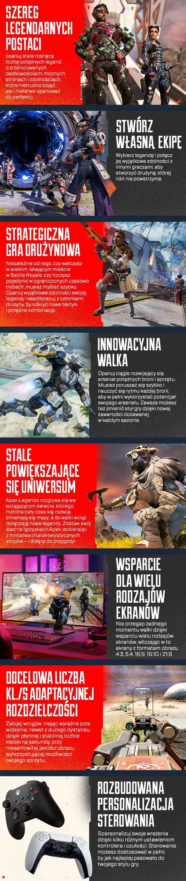 Opanuj stale rosnący panteon legend, zanurz się w taktyczną drużynową rozgrywkę pełną świeżych rozwiązań, które wykraczają poza gatunek Battle Royale – a to wszystko w surowym, pozbawionym zasad świecie. Witaj w nowym wcieleniu strzelanki z bohaterami.