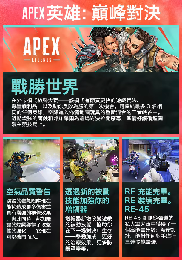 《Apex 英雄》是一款由 Respawn Entertainment 打造的獲獎免費英雄射擊遊戲。掌握一系列不斷增加且擁有強大技能的傳說級角色,並體驗戰略性小隊玩法和新一代英雄射擊與大逃殺遊戲中的創新玩法。