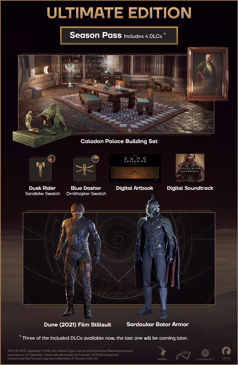 Includes 3 items: Dune: Awakening, Dune: Awakening - Deluxe Edition Upgrade, Dune: Awakening - Ultimate Edition Upgrade