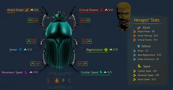 Heragos can improve his stats in different ways. He can increase his health, armor, speed, and his average damage by using potions, honing machines, sacred rocks, and beetles. There are three types of potions available and they affect Heragos' core stats when used whereas sacred rocks help him fight against his enemies during missions and combats. Heragos can use the honing machine to improve his weapon in three different specs: sharpness, weight, and durability. An NPC blacksmith is required to upgrade the weapon to the next level. Players can collect beetles by slicing clot worms, digging up beetle nests, and opening beetle chests, and can use them in the stat menu to dynamically increase/decrease sub-stats of Heragos. These sub-stats give players a chance to elastically adopt a gameplay style that serves their desire. See the stat menu below for more details and a better visualization: