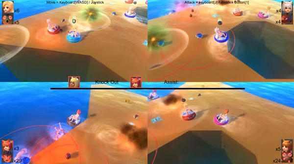 1.This is an action game.It supports multiplayer fighting.You can experience the feeling that you played bumper cars when you were a child.You can attack your opponents by hitting and launching bombs.You will win the game when all enemies fall into the sea.