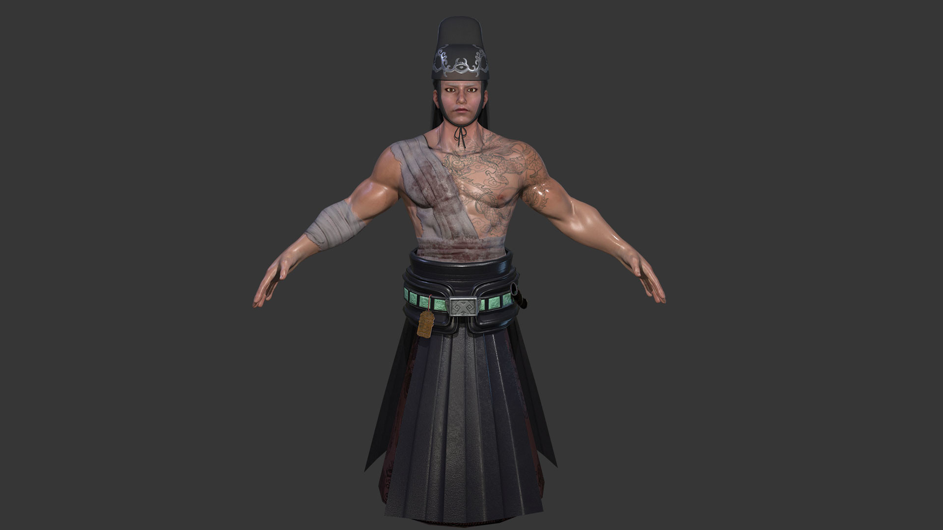The rusty flying fish pattern on the black skirt is luxurious and solemn. It is shirtless, with bandages around the waist, showing the heroism of the battlefield.