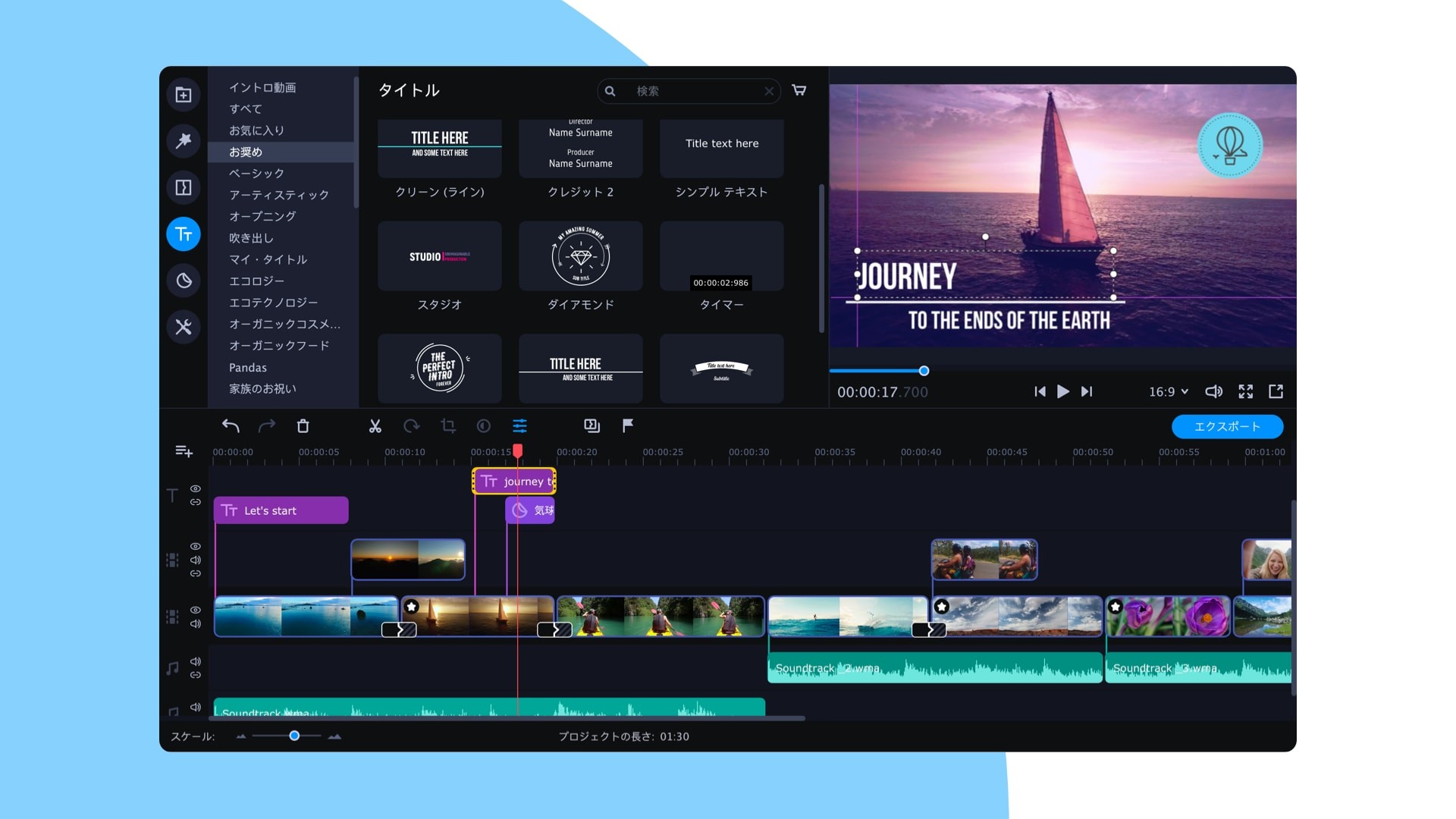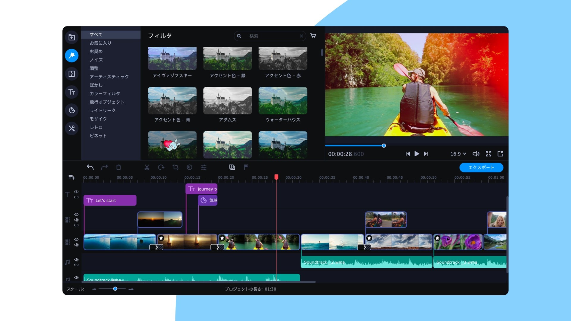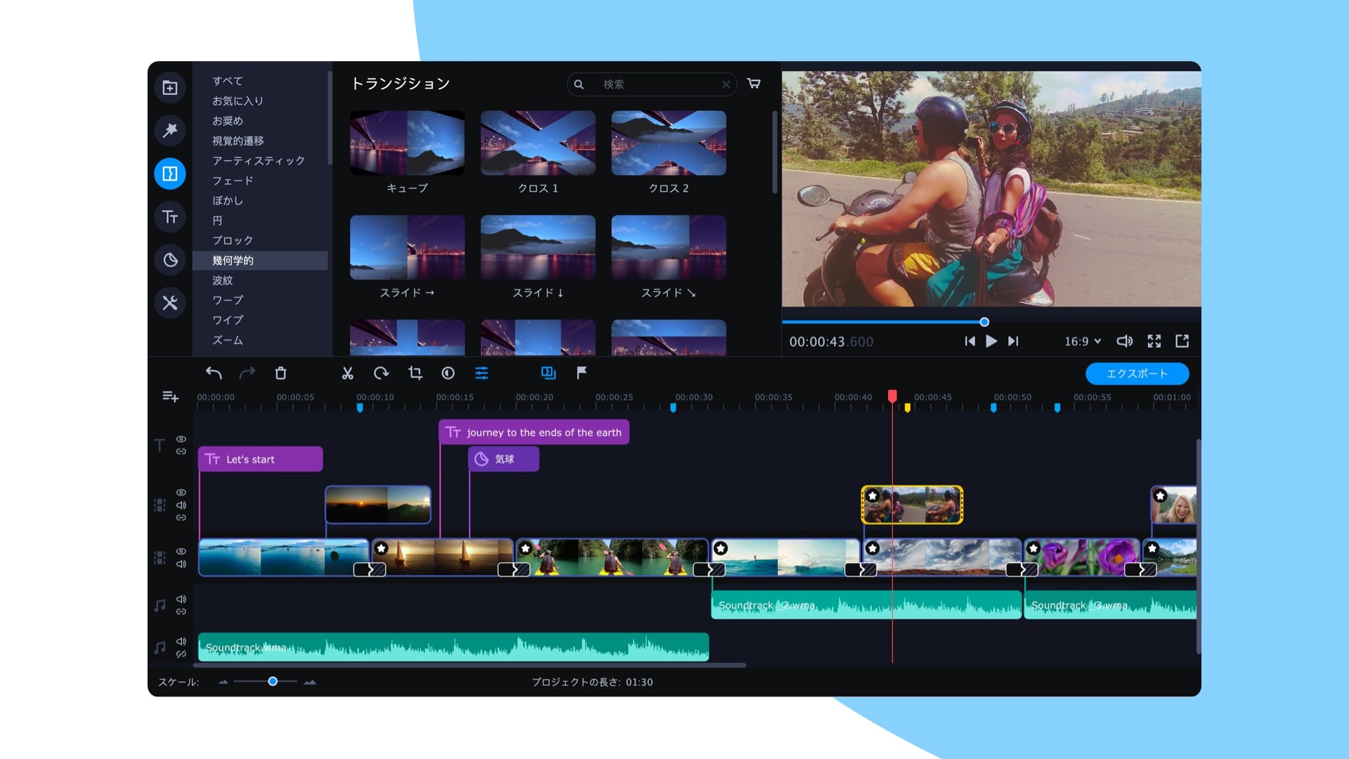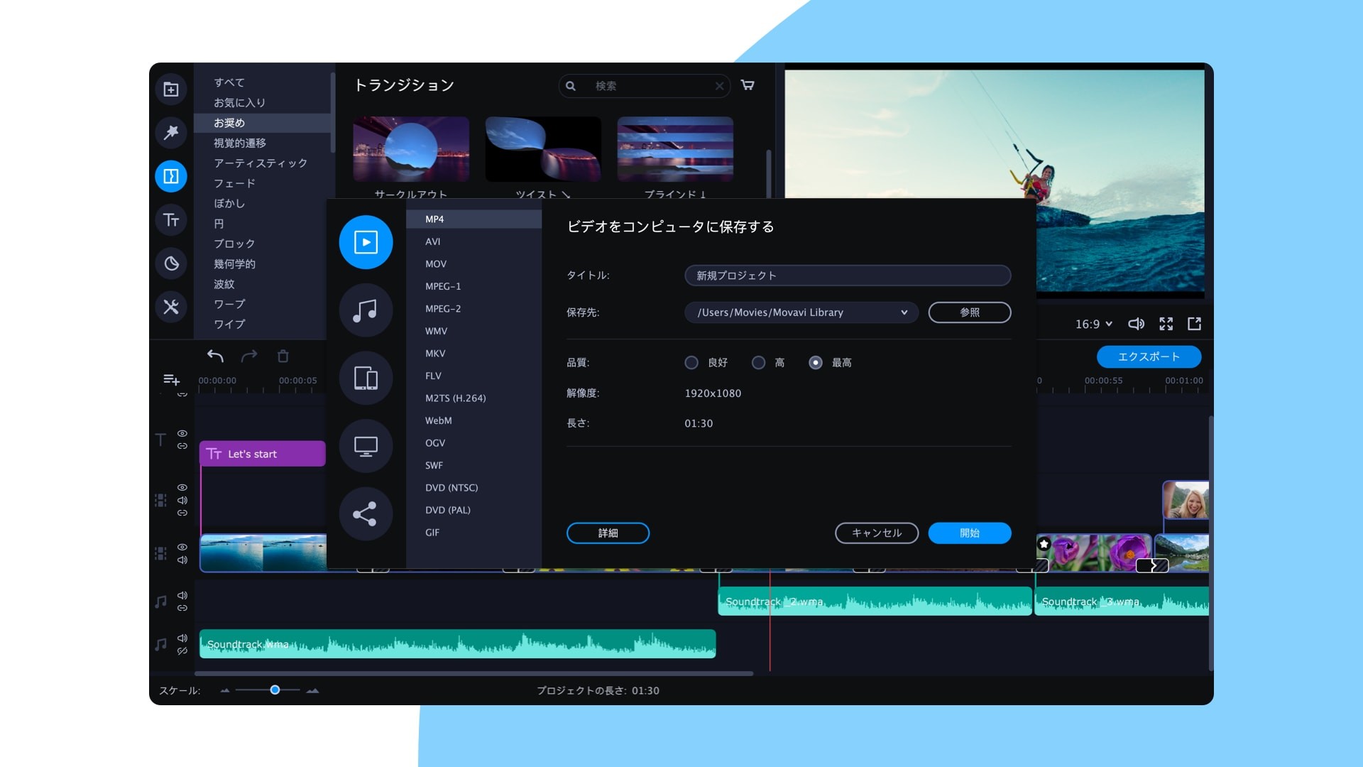 Movavi Video Editor Plus 2020であなたの創造性を自由に発揮してください!その直感的なコントロールにより、クリップの切り取りや結合、特殊効果とタイトルの追加などの編集をすぐに開始し、その結果をプログラムから直接YouTubeにアップロードできます。 Movaviを使えば高速・簡単、かつ楽しくビデオを編集できます。