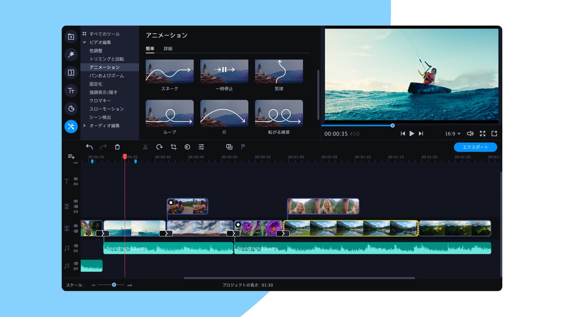 プロ級の結果を得るために、複雑なプロ用ソフトウェアで苦労する必要はありません。Movavi Video Editor Plus 2020は、シンプルさと機能性が完璧に融合しています。