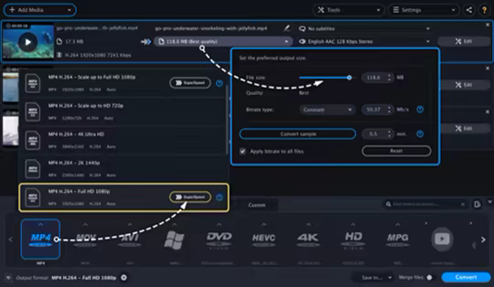 Convert files for mobile phones, tablets, laptops, and TVs. Now you can upload subtitles from within the program: search for the name of the movie or series number. Compress HD and Full HD movies so you can save space on your hard drive or upload to YouTube, Vimeo, or other sites. Before converting a video, you can enhance the audio- and video files using the built-in editor. Compress large files to save disk space and prepare them for sharing online on YouTube, Vimeo, and other video hosting sites. The SuperSpeed mode guarantees conversion in no time. You can also take advantage of other types of hardware acceleration: Intel HD Graphics, AMD, NVIDIA NVENC and CUDA.