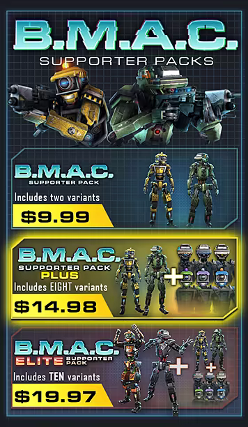 Rep your support for NS2 Development with the purchase of the B.M.A.C. Supporter Packs! Purchase of this pack will get you the most unique cosmetic to date with two entirely new player models for marines players to choose from, with up to 8 different color variants. Find out more about the B.M.A.C. model and color variants below.