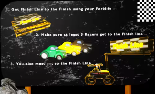 Besides clearing the tracks, every track needs a Finish Line. It is one of your jobs to put the Finish Line in place at the end of the Race Track. You can push the Finish Line to the Finish..., or you can use your Forklift add-on/tool to put it in place.